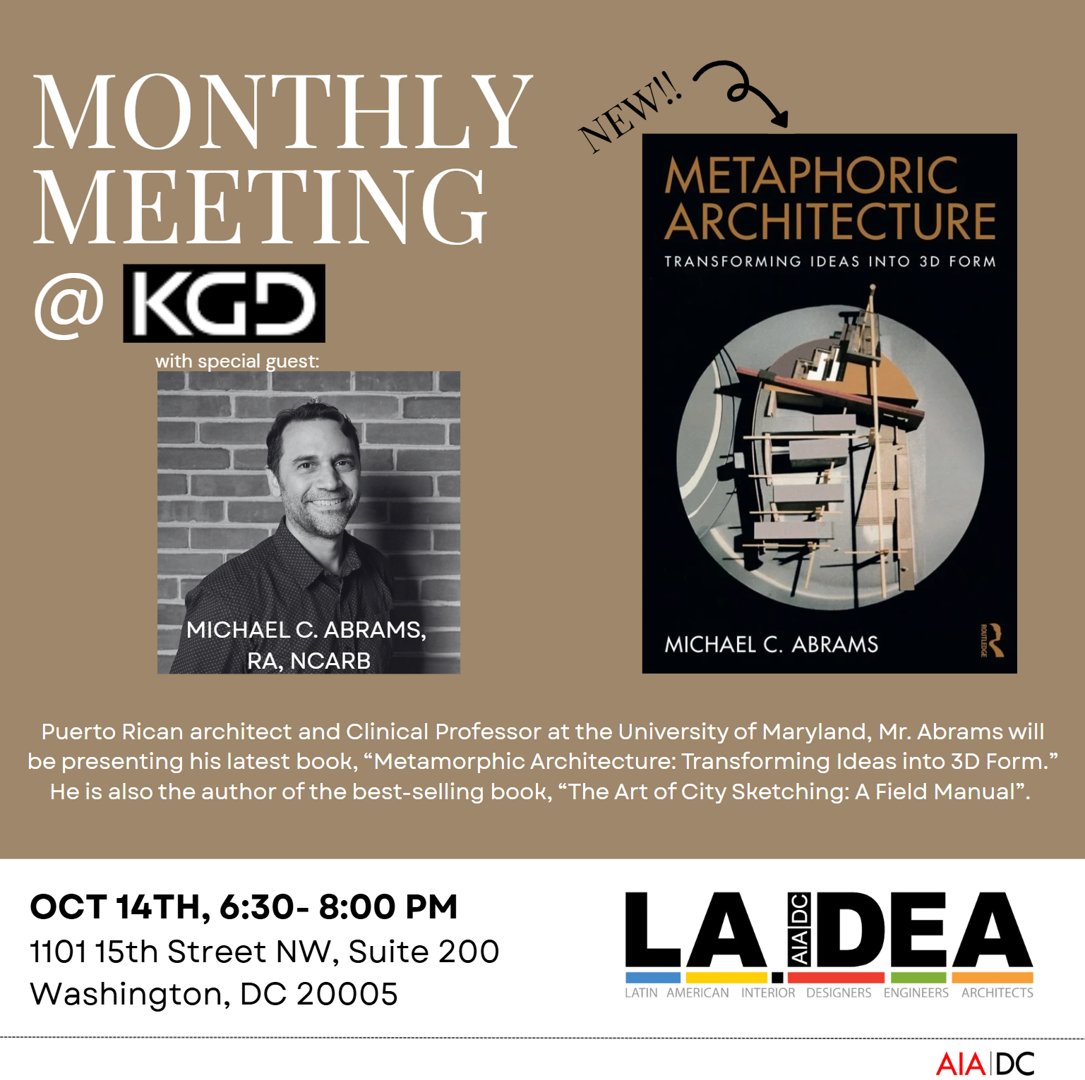 Join LA.IDEA’s October 14th monthly meeting at KGD DC. Puerto Rican architect and Clinical Professor at the University of Maryland, Mr. Abrams will be presenting his latest book, “Metamorphic Architecture: Transforming Ideas into 3D Form.” He is also the author of the best-selling book, “The Art of City Sketching: A Field Manual.